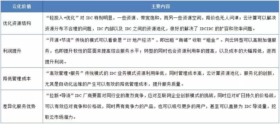 對于傳統IDC提供商來說,只提供基礎設施增值空間有限,同時也無法適應逐漸復雜的云環境,同時云計算的發展也使得IDC面臨更加復雜的競爭。云服務商的興起,使得IDC云化成為必然趨勢,下圖是IDC云化的優勢:
